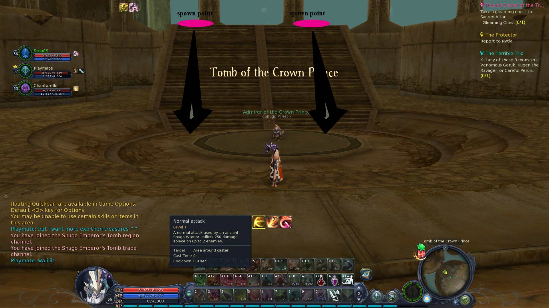The Shugo Imperial Tomb has three levels that should be completed. Each level is much harder than the previous one, and contains more difficult enemies to defeat. Once you enter the instance you will be transformed into Shugo warrior. Your personal stats and skills are not usable in the instance, since you get a new skill bar after the transformation. Damage amount is equal for all players regardless of level.